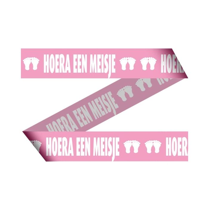 Roze afzetlint met de tekst 'Hoera een Meisje'. Het lint is 15 meter lang.