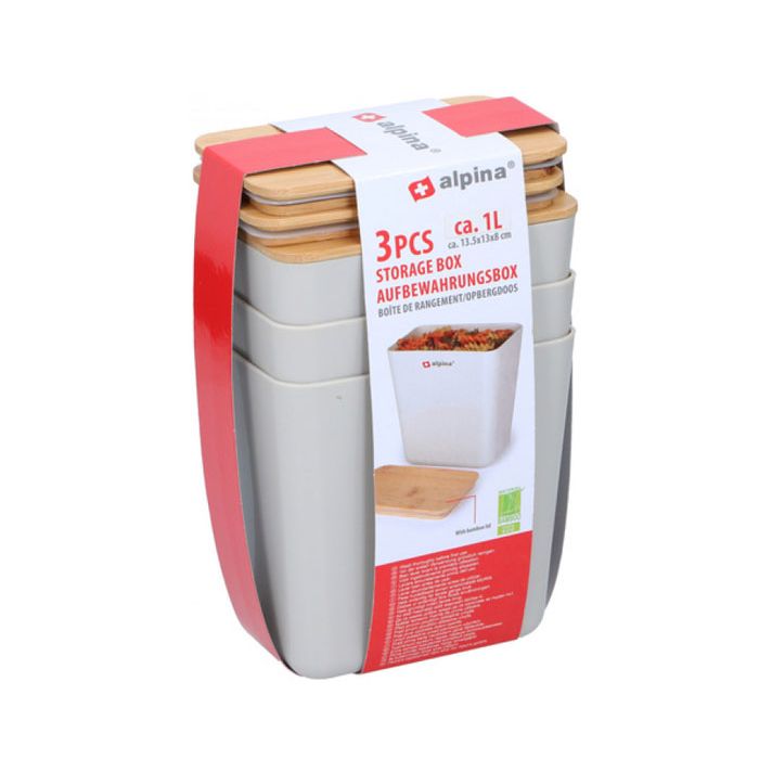 Handige opbergdoosjes met bamboedeksel van Alpina. De set bestaat uit drie doosjes met een inhoud van ca. 1 liter. De doosjes hebben een afmeting van 13,5x13x8cm.