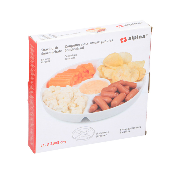 Wil jij al je favoriete snacks op tafel? Serveer ze dan op deze 5-vaks snackschaal van Alpina. Van borrelnootjes en chips tot wortel en snoeptomaatjes met een dip in het midden. Voor in het weekend of tijdens een feestje.