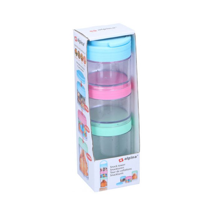 Handige stapelbare voorraadpotten van Alpina voor snacks onderweg. Ideaal voro kleine porties groenten, noten, fruit en nog veel meer. De set bestaat uit 2 kleine potten van 200ml en 1 grote pot van 400ml. De potten kunnen afzonderiljk worden gebruikt of afzonderiljk op elkaar worden geschroefd om een toren te vormen.