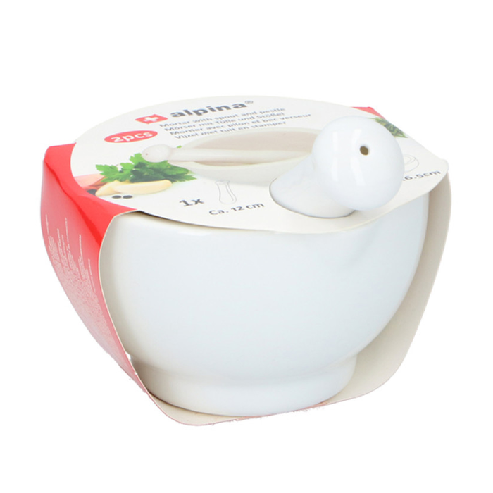 Porceleinen vijzel met tuit en stamper van Alpina. De vijzel heeft een doorsnede van 10cm en is 6,5cm hoog. De stamper heeft een lengte van 12cm.