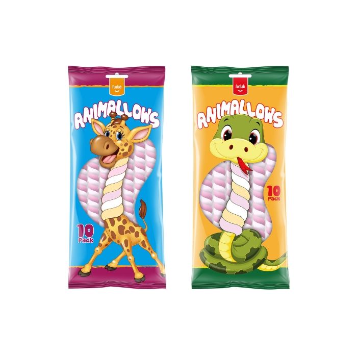 Animallows van Funlab. Elke verpakking bevat 10 voorverpakte marshmallows van 8 gram. Leuk om te trakteren of trakataties mee te maken! Let op: je ontvangt een willekeurige design verpakking (giraf of slang).