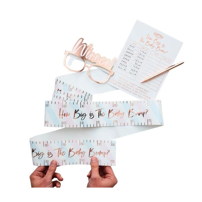 Speel dit spel tijdens een babyshower waarbij iedereen de buikomvang van de toekomstige mama moet raden! Noteer de voorspellingen op de scorekaart en meet daarna de daadwerkelijke buikomvang met het meetlint. Wie wint de winnaarsbril?