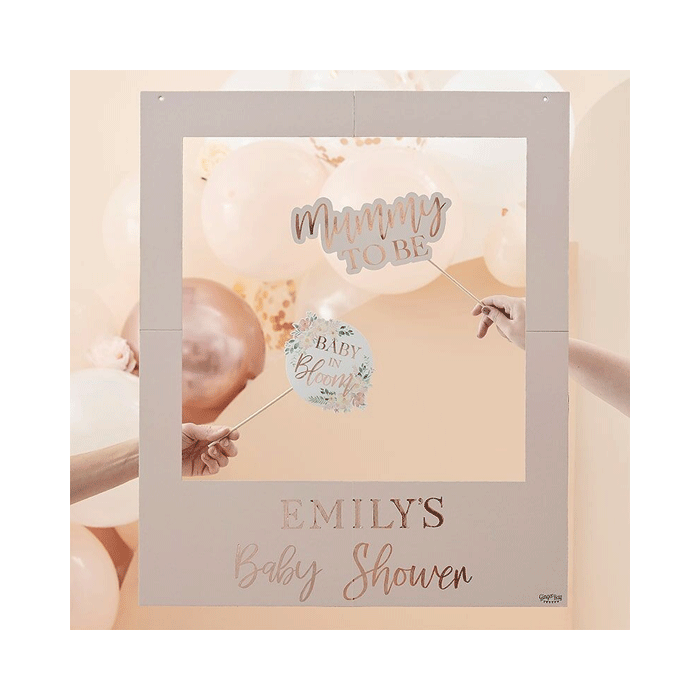 Maak de leukste foto's met deze personaliseerbare babyshower fotoframe (inclusief letterstickers) van het merk Ginger Ray. Het frame heeft een lichtroze blush kleur bedrukt met roségouden tekst 'Baby Shower'. Met de bijgeleverde stickers kun je de naam van de mommy to be aan toevoegen. Inclusief 8 stickervellen, 4 stickers om het frame bij elkaar te houden en 1 meter draad om op te hangen.