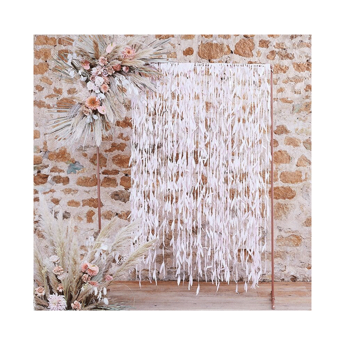 Roze leaf backdrop uit de serie A Touch Of Pampas van Ginger Ray. In de set zit maar liefst 100 meter aan lint met lichtroze bladeren aan. Knip bijvoorbeeld 2 meter decoratie draad af en bevestig deze met pin-ups aan de muur of gebruik een ijzeren of houten backdrop zoals op de foto. Knip vervolgens de 100 meter slinger in stukken en drapeer deze over het gespannen draad of buis. Knip de slinger aan de onderkant bij, mocht er teveel lengte verschil in zitten.