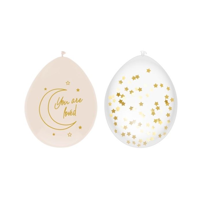 Baby safari ballonnen. Het setje heeft 6 ballonnen met 3 transparante confettiballonnen met goud en beige sterren en 3 beige/nude ballonnen met opdruk ’You are loved’. Leuk voor een geboorte of babyshower in safari thema. Perfect te combineren met andere producten uit de prachtige Baby Safari Nude collectie.