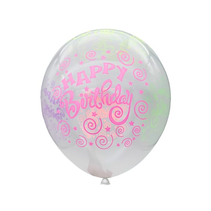 Transparante latex ballonnen bedrukt met 'Happy Birthday', sterretjes, swirls, confetti en feesthoedjes in verschillende neon kleuren. Elke verpakking bevat tien ballonnen.