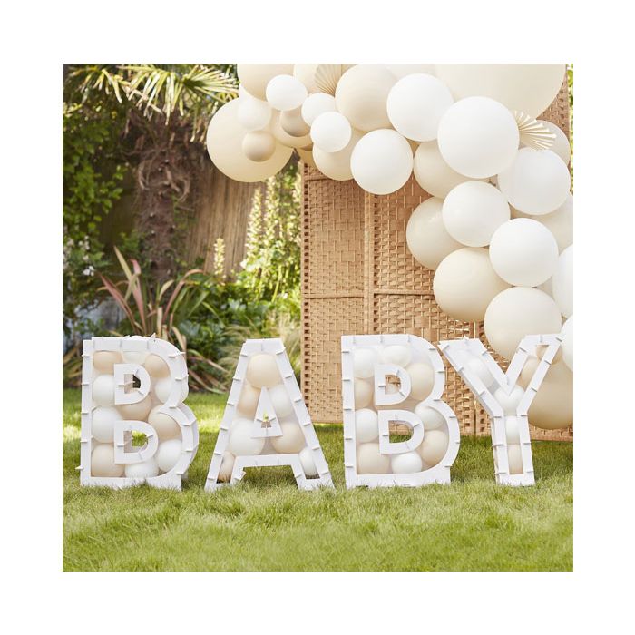 Elke verpakking bevat 4 x ballonmozaïekletters met de tekst BABY: