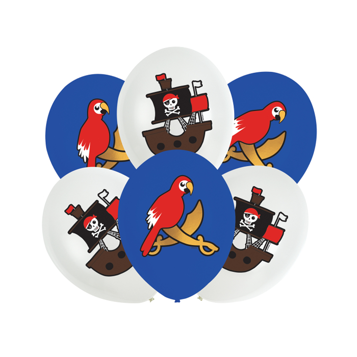 Stoere Piraten ballonnen met opdruk van een papegaai en piratenschip. Ideaal voor een kinderfeestje met Piraten thema. De ballonnen hebben een afmeting van 27cm en zijn verpakt per 6 stuks.
