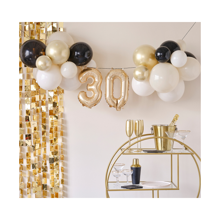 Toon deze stijlvolle ballonslinger op je 30e verjaardag voor een luxe uitstraling. Deze mijlpaal slinger heeft een prachtige mix van champagne goud, zwart en nude ballonnen die er geweldig uit zullen zien als je de hele nacht door feest!