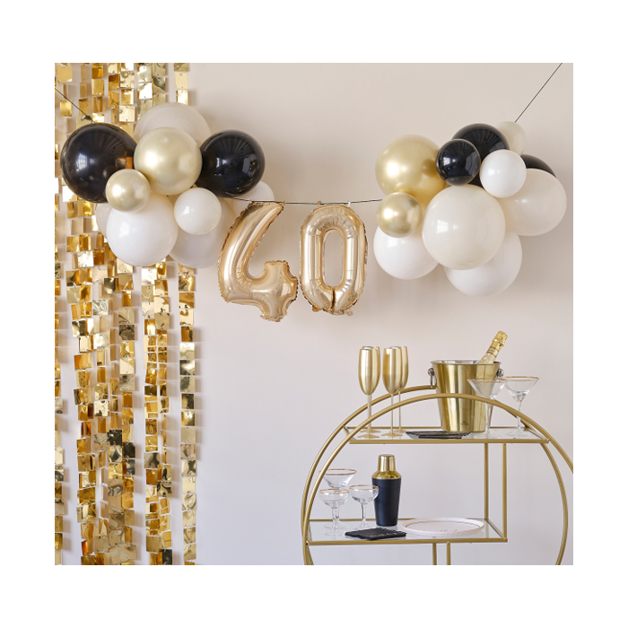 Toon deze stijlvolle ballonslinger op je 40e verjaardag voor een luxe uitstraling. Deze mijlpaal slinger heeft een prachtige mix van champagne goud, zwart en nude ballonnen die er geweldig uit zullen zien als je de hele nacht door feest!