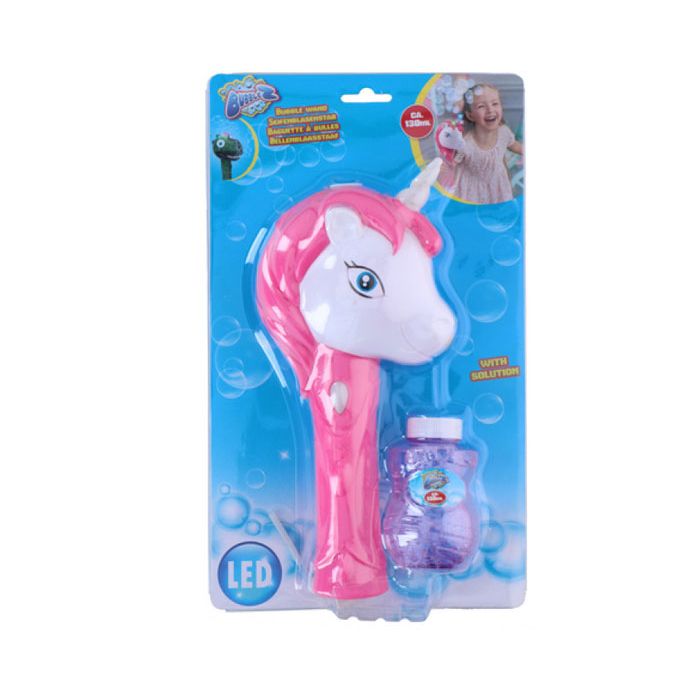 Unicorn bellenblaasstaaf met LED en ca. 130ml oplossing. Exclusief 3x AA batterijen.