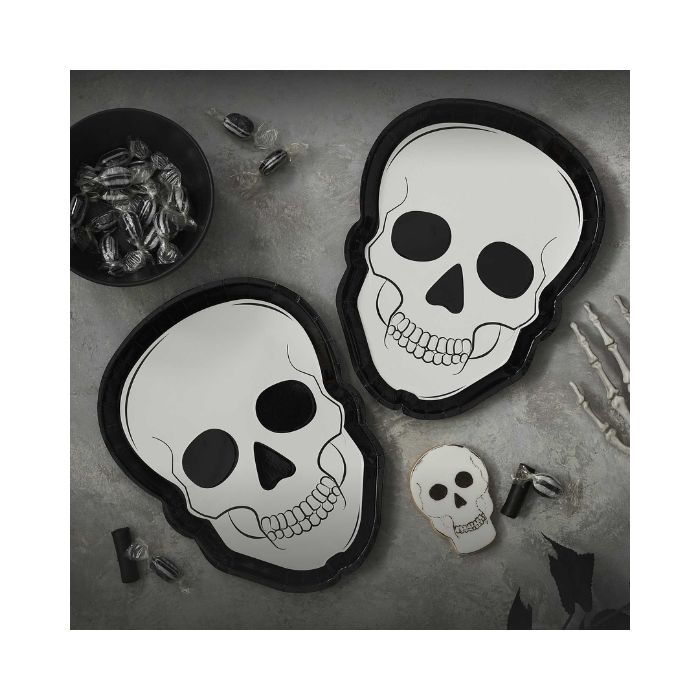 Creëer een huiveringwekkende Halloween-feesttafel met deze schedelvormige papieren borden, ideaal om je Halloween-feesttafel tot leven te laten komen.Deze Halloween Skull-borden zullen je gasten zeker in een griezelige sfeer brengen. Elke verpakking bevat 8 Halloween-borden van 26 x 20 cm.