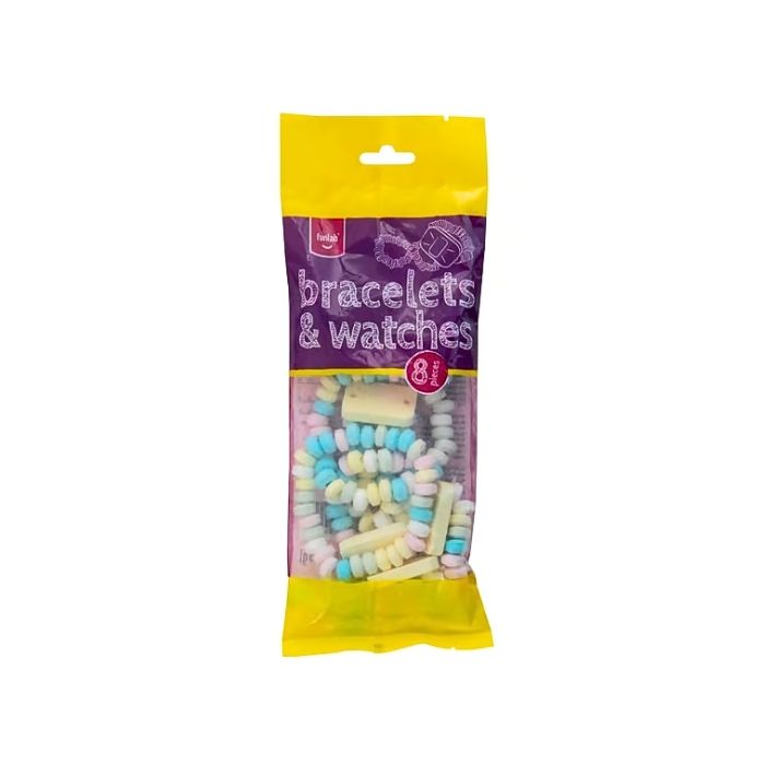 Dextrose snoep armband en horloge van Funlab. Leuk om te trakteren of als sieraad. Elke verpakking bevat 8 armbanden.