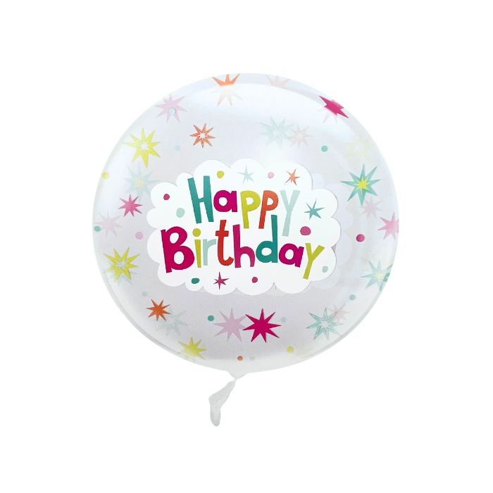 Bubble ballon met de tekst 'Happy Birthday' met een diameter van ongeveer 60 cm. Bubble ballonnen zijn gemaakt van doorzichtig rekbaar kunststof. Bubble ballonnen rekken enorm uit tot ze een mooie ronde vorm hebben, zonder kreukels bij de naden. Voor het vullen heb je een goede ballonnenpomp nodig of heliumtank met latex ventiel. Het voordeel van deze ballon is dat hij niet oxideert en dat je er doorheen kunt kijken, dit zorgt voor een 3D effect.