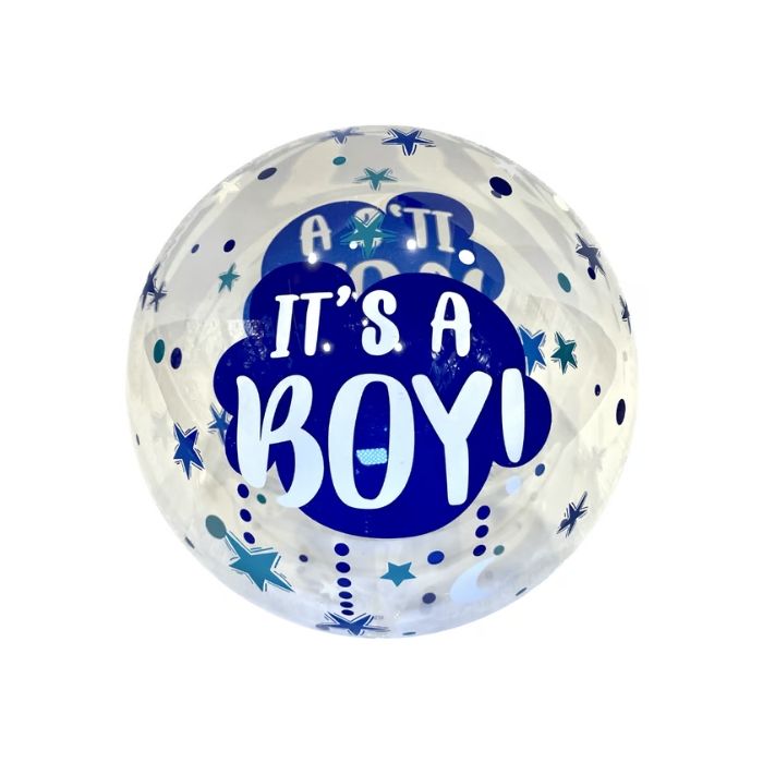 Bubble ballon met de tekst 'It's a Boy!' met een diameter van ongeveer 60 cm. Bubble ballonnen zijn gemaakt van doorzichtig rekbaar kunststof. Bubble ballonnen rekken enorm uit tot ze een mooie ronde vorm hebben, zonder kreukels bij de naden. Voor het vullen heb je een goede ballonnenpompp nodig of heliumtank met latex ventiel. Het voordeel van deze ballon is dat hij niet oxideert en dat je er doorheen kunt kijken, dit zorgt voor een 3D effect.