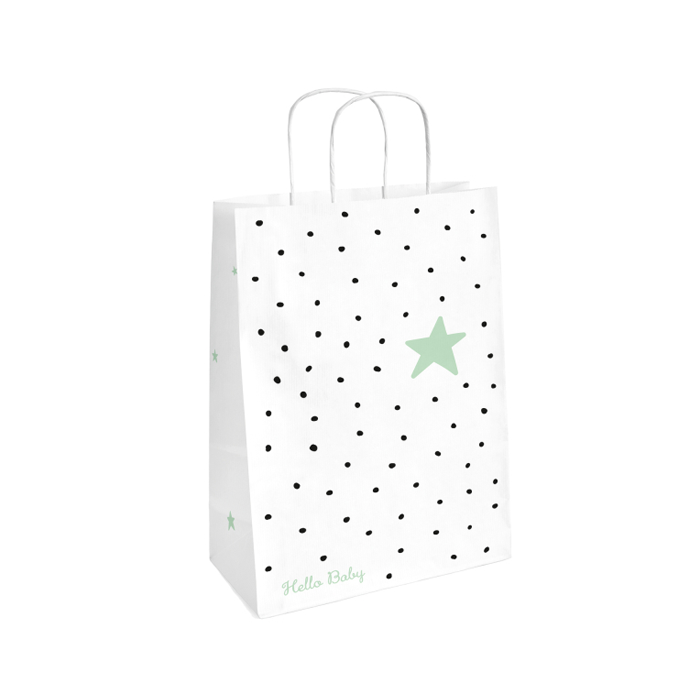 Schattige papieren cadeautasjes met zwarte stippen, een groene ster en de tekst 'Hello Baby'. Perfect voor een babyshower of gender reveal. Elke verpakking bevat 8 tasjes met een afmeting van 23,4x16,2cm.