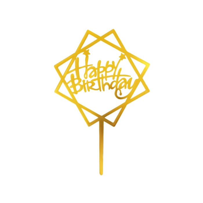 Gouden achthoekige caketopper met in het midden de tekst 'Happy Birthday'. De caketopper is 16 cm hoog en 10,5 cm breed.