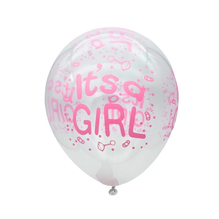 Set van 10 transparante latex ballonnen met de tekst 'It's a Girl' in roze letters. De ballonnen zijn in de optimale opgeblazen vorm 30 cm groot. Ideaal voor een babyshower!