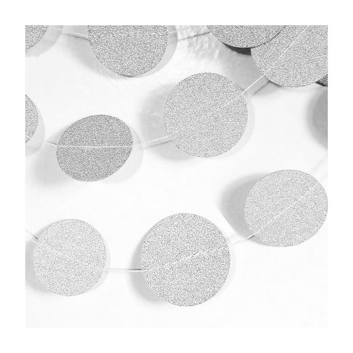Papieren slinger met zilveren glitter rondjes. De slinger is ongeveer 2,5 meter lang. De rondjes hebben een doorsnede van 6,8 en 5,5 cm.