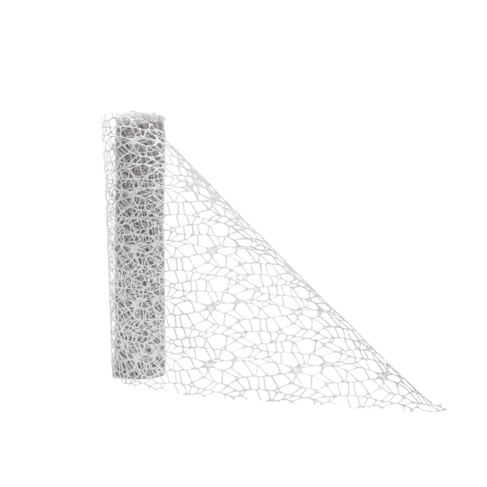 Prachtige spider mesh decoratiestof van polyester in het zilver met glitter. Je kan de decoratiestof gebruiken als tafelloper, maar ook voor het versieren van bijvoorbeeld een cadeau.