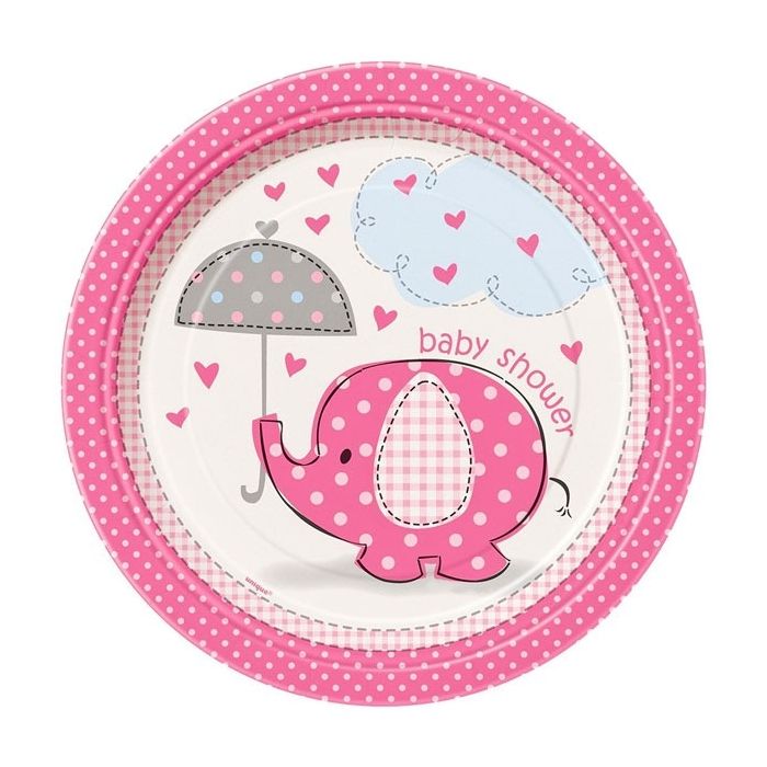 Kartonnen babyshower bordjes met een olifantje in het roze. De bordjes hebben een diameter van 17,5 cm en zijn verpakt per 8 stuks.