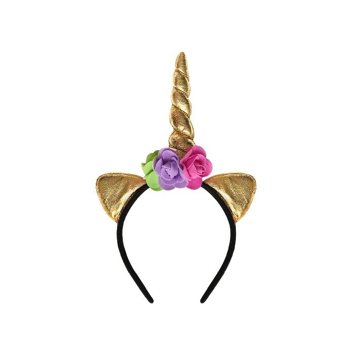 Haardiadeem met twee glitter oren en een gouden hoorn. In het middel zitten drie bloemen ter versiering. Leuk voor een unicorn feestje!