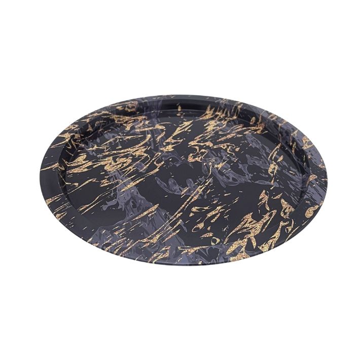 Metalen dienblad met zwart en goud marmer print. Ideaal voor het serveren van drankjes en eten of als decoratieve accessoire voor op tafel. Het dienblad heeft een doorsnede van 32cm.