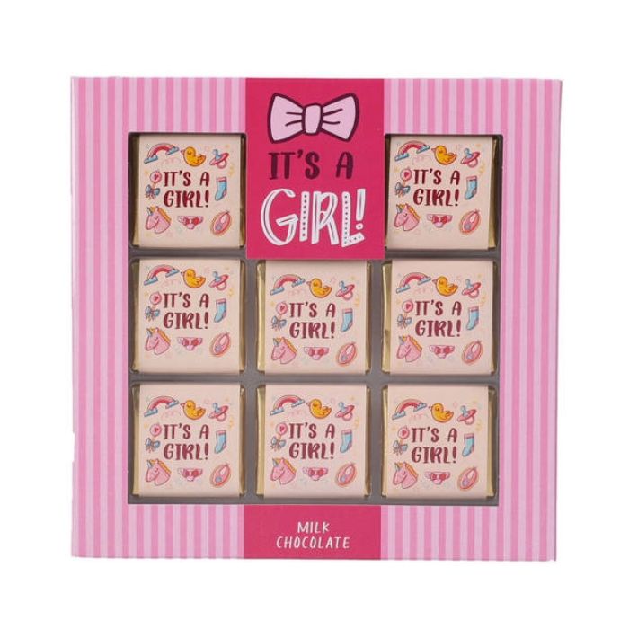 Vierkante melkchocolade napolitains met een bedrukte wikkel met de tekst "It's a Girl". Elke verpakking bevat 9 chocolaatjes, ideaal voor een babyshower of als geboortegeschenk. De heerlijke chocolaatjes zijn een traktatie voor de smaakpapillen, en de schattige wikkel met de tekst "It's a Girl" voegt een speciale touch toe. Met 9 chocolaatjes per doosje kunnen gasten genieten van deze zoete lekkernij terwijl ze de komst van de nieuwe baby meid vieren. Laat de chocolade smelten in hun mond terwijl ze uitkijken naar deze vreugdevolle gelegenheid. Een perfect cadeau om deze speciale gebeurtenis te vieren!