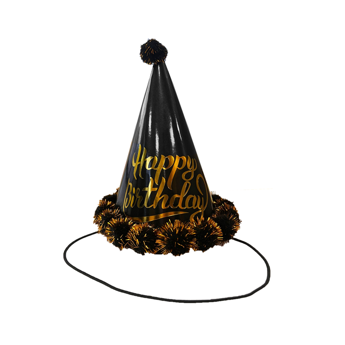 Feesthoed Happy Birthday Zwart/Goud + Pompoms
