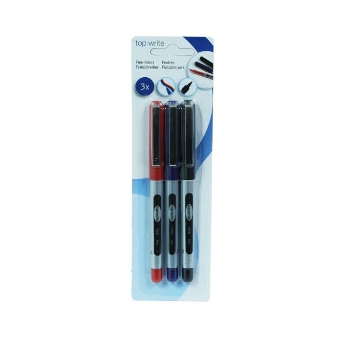 Topwrite fijnschrijvers driedelig, in de kleuren rood, blauw en zwart.