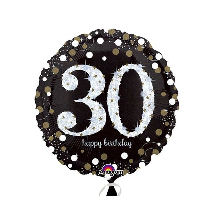 Zwarte folie ballon met metallic gouden en zilveren cirkels & sterretjes voor een 30e verjaardagsfeest. De ballon is 45 cm groot en kan met helium of lucht worden opgeblazen.