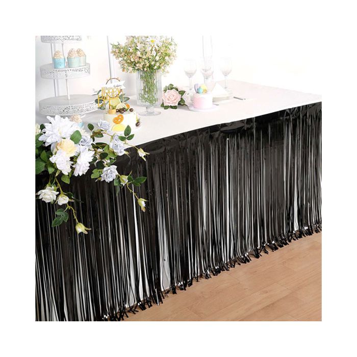 Decoreer je tafel met deze folie fringe tafelrok slinger in het zwart. De tafelrok heeft een afmeting van 275x74cm (bxh).