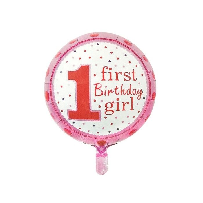 Ronde folieballon met '1 first Birthday girl' opdruk en stippen. Perfect voor de eerste verjaardag van een meisje! De folieballon heeft een afmeting van ongeveer 45 cm en kan met lucht of helium worden gevuld.