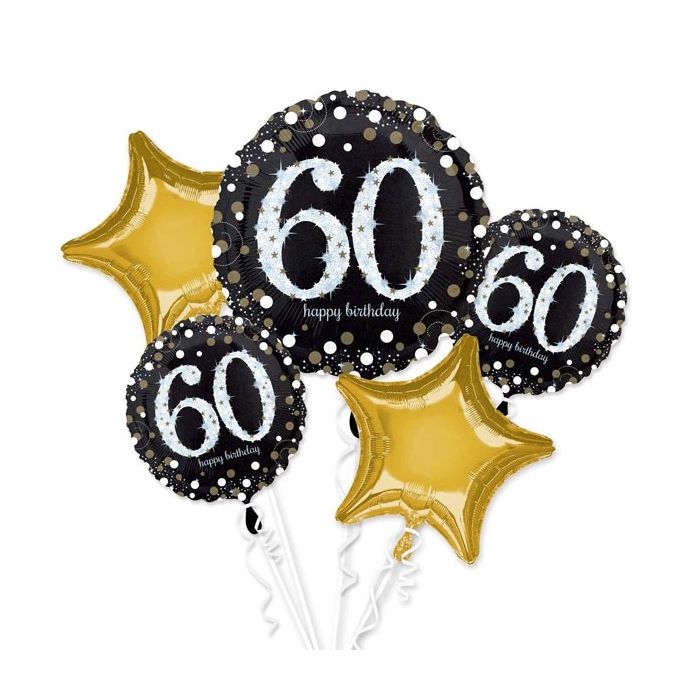 Boeket van 5 folie ballonnen voor een spetterende 60e verjaardag. De set bestaat uit: