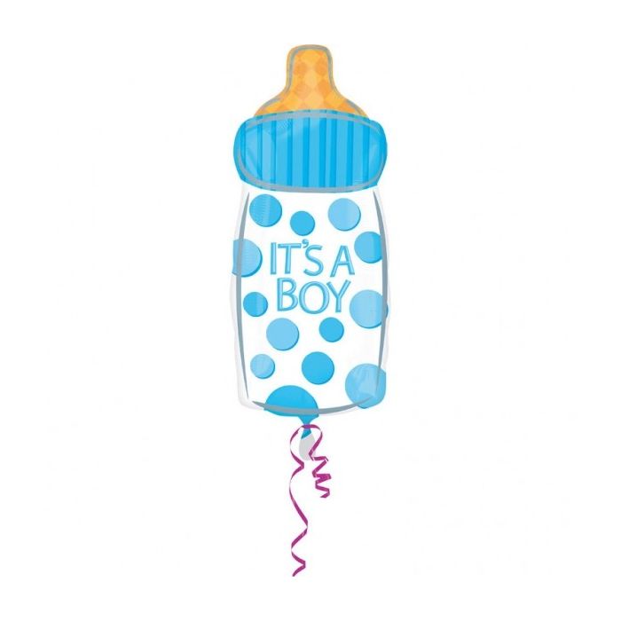 Blauwe folieballon in de vorm van een fles, met daarop de tekst 'It's a Boy'. Geschikt om met lucht of helium op te blazen. De folieballon heeft een afmeting van 58 x 25 cm wanneer hij opgeblazen is.