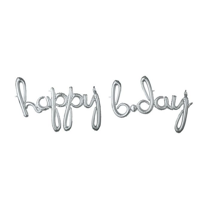 Zilveren folieballonnen met de tekst 'happy b'day'. Alleen geschikt om met lucht op te blazen. Rietje en lintje inbegrepen.