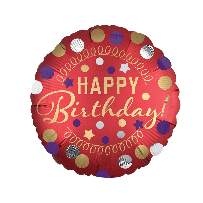 Rood satijnen folieballon met de tekst Happy Birthday! versierd met sterretjes en stippen.
