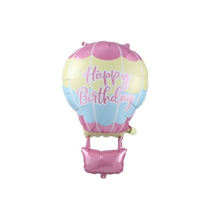 Folieballon in de vorm van een luchtballon in pastel kleuren en de tekst 'Happy Birthday'. De folieballon heeft een afmeting van circa 52x80cm en kan met lucht of helium worden gevuld.