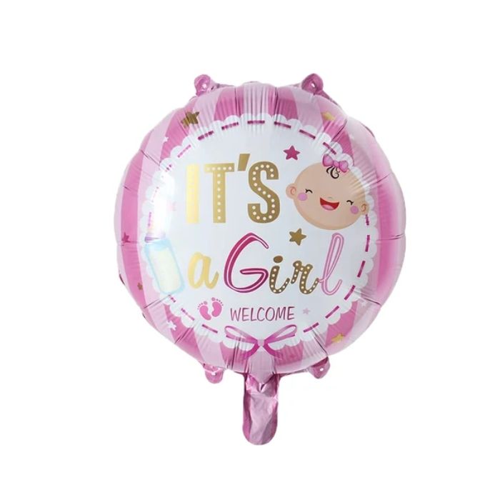 Schattige folieballon voor een babyshower of kraamvisite. De folieballon is roze en wit van kleur, en is bedrukt met de tekst 'It's a Girl, Welcome'. Daarnaast bevat het een afbeelding van een babyhoofdje, papflesje, voetafdruk en sterren. De folieballon heeft een diameter van circa 45 cm en kan met lucht of helium worden gevuld.