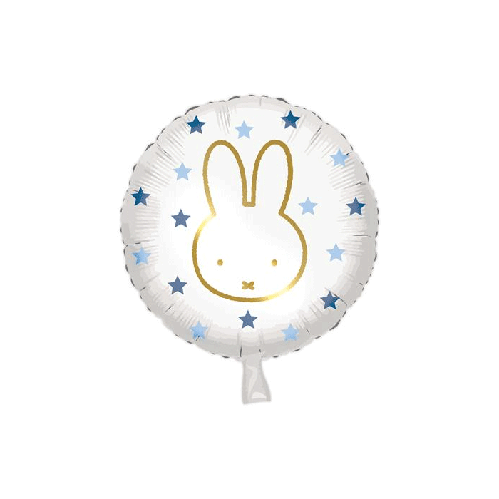 Feest met Nijntje! Ronde folieballon met blauwe sterretjes en opdruk Nijntje in het goud. Leuk voor een kraamfeest, babyshower of verjaardagsfeest.