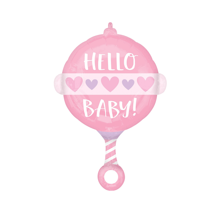 Ga je op kraamvisite? Verras de kersverse ouders met deze roze Hello Baby! folieballon in de vorm van een rammelaar. Ook leuk als decoratie tijdens een babyshower.