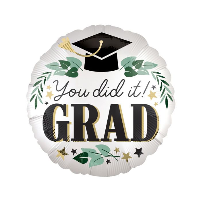 Folieballon met een afbeelding van een afstudeer hoedje en de tekst 'You did it! Grad'. Leuk om als cadeau te geven aan de geslaagde. De folieballon is 45cm groot en kan met lucht of helium worden gevuld.