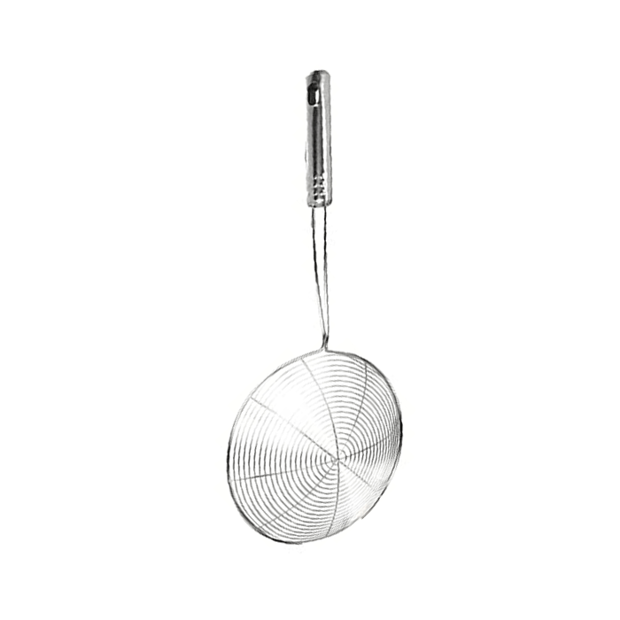 Grote frituurspaan van RVS om vet uit de frituur snel af te laten vloeien. De spaan heeft een doorsnede van ongeveer 17 cm.