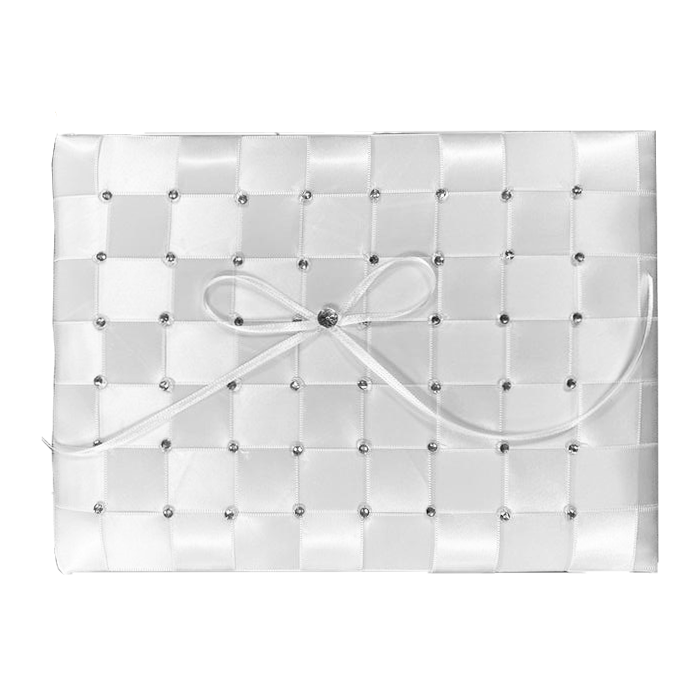Wit gastenboek in blok- en strass design, bestaande uit 35 pagina's, waarvan 32 pagina's bestemd voor boodschappen/berichten van gasten. Het gastenboek heeft een afmeting van 24 x 17,5 x 3 cm (LxBxH).