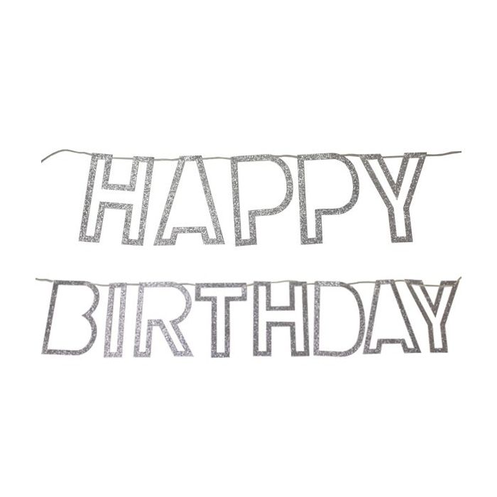 Sprankelende Happy Birthday glitterslinger in het zilver. De letters zijn 10 x 15 cm en zijn gemaakt van stevig papier. De slinger bevat een lint om de slinger op te hangen.