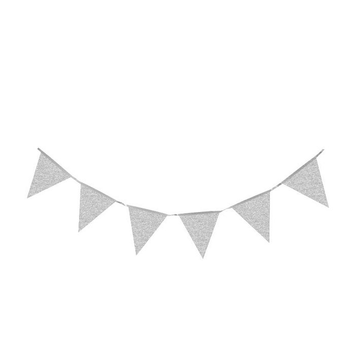 Kartonnen glitterslinger / vlaggenlijn in het zilver. Op de vlaggenlijn hangen 12 vlaggetjes. De vlaggenlijn is 6 meter lang. Een vlag heeft een afmeting van 17x18,5cm.