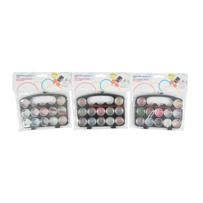 Transformeer je kunstwerkjes tot sprankelende meesterwerken met deze glitterverfset. Deze set bevat een palet met 12 kleuren glitterverf op waterbasis en een penseel.