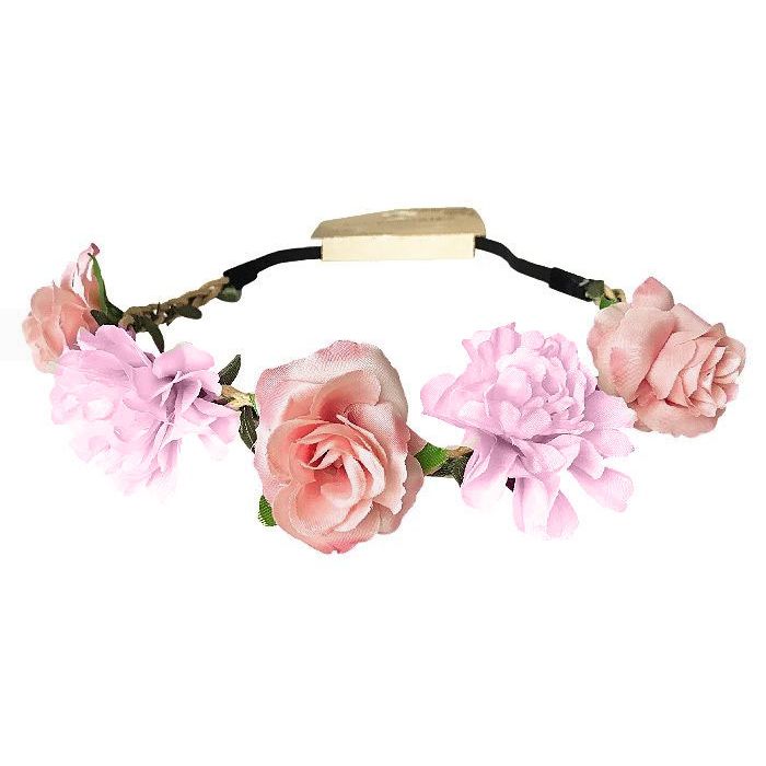 Mooie elastische haarband met vijf decoratieve bloemen van textiel in lichtroze kleur. Leuk voor een thema- of verkleedfeest!