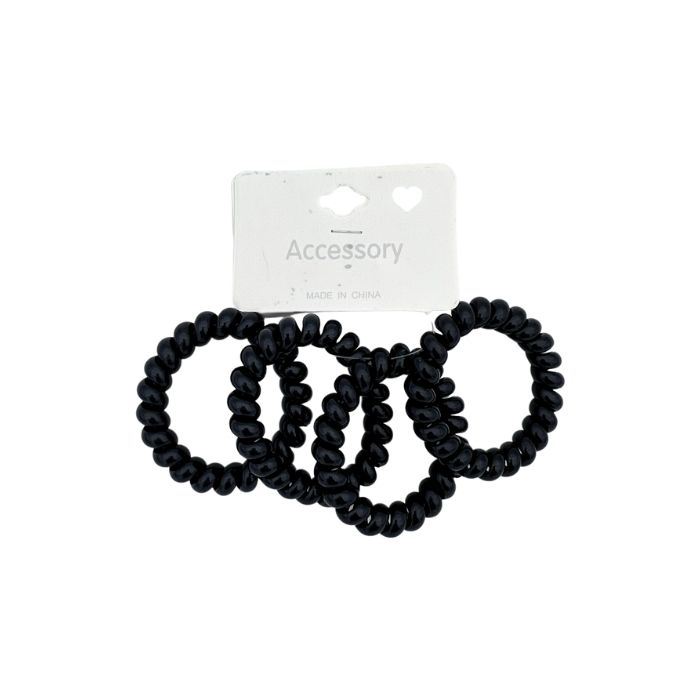 Een set van vier zwarte spiraal elastiekjes. Spiraal elastiekjes zorgen ervoor dat je haar minder beschadigt en dat de haarpunten niet splijten.